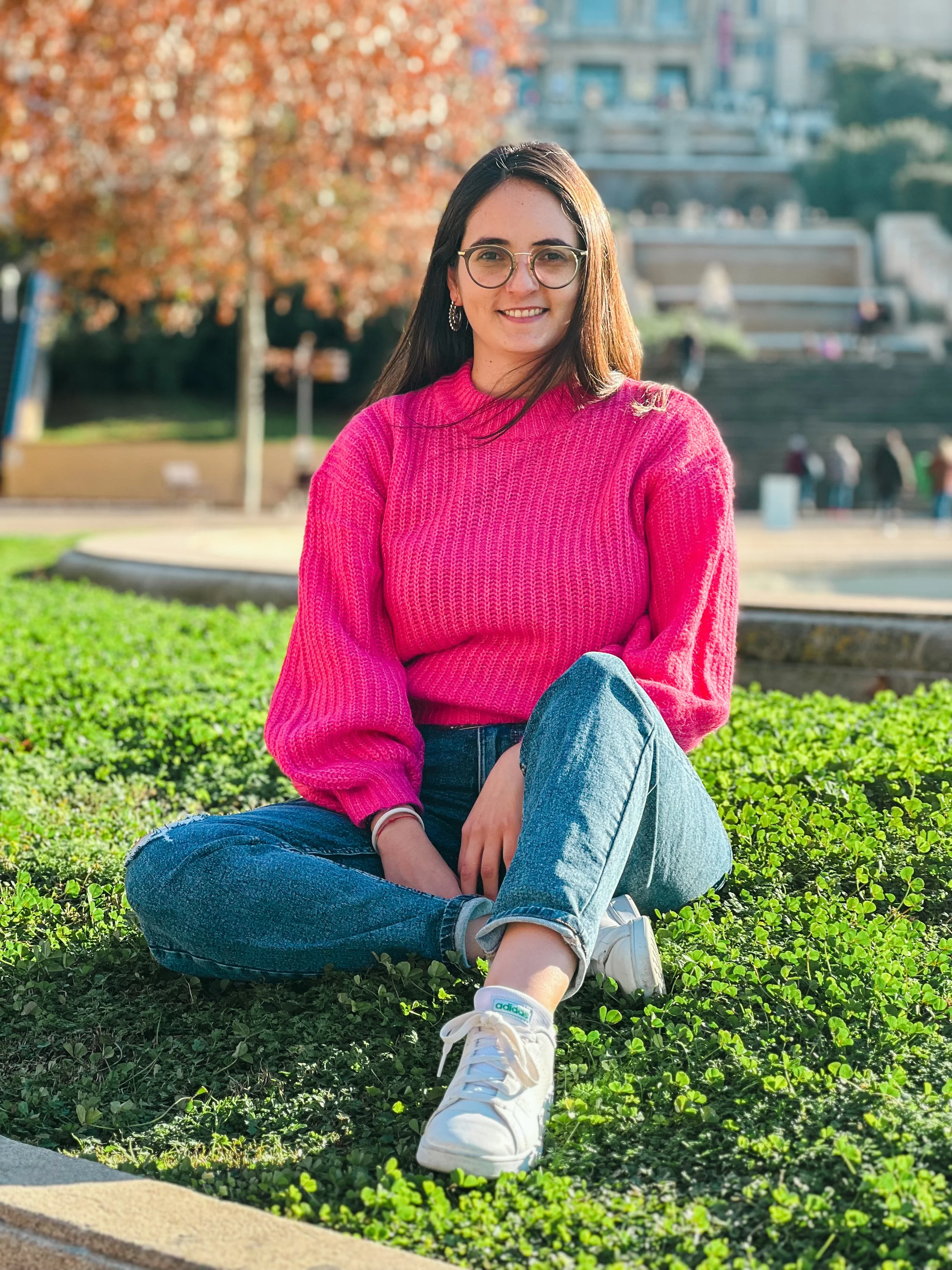 A young woman with glasses and long hair, sitting cross-legged on grass in a park, wearing a bright pink sweater, blue jeans, and white sneakers, smiling at the camera with a background of autumn trees and steps.
